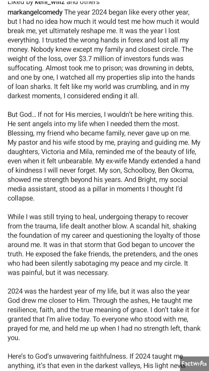 3.7 million usd of investors’ funds, faced crushing debts, and nearly lost everything—including my freedom,” he wrote. The comedian admitted the crisis drove him to the brink of despair, even revealing suicidal thoughts. His candid confession highlighted the risks of speculative trading and the lack of transparency in Forex markets.