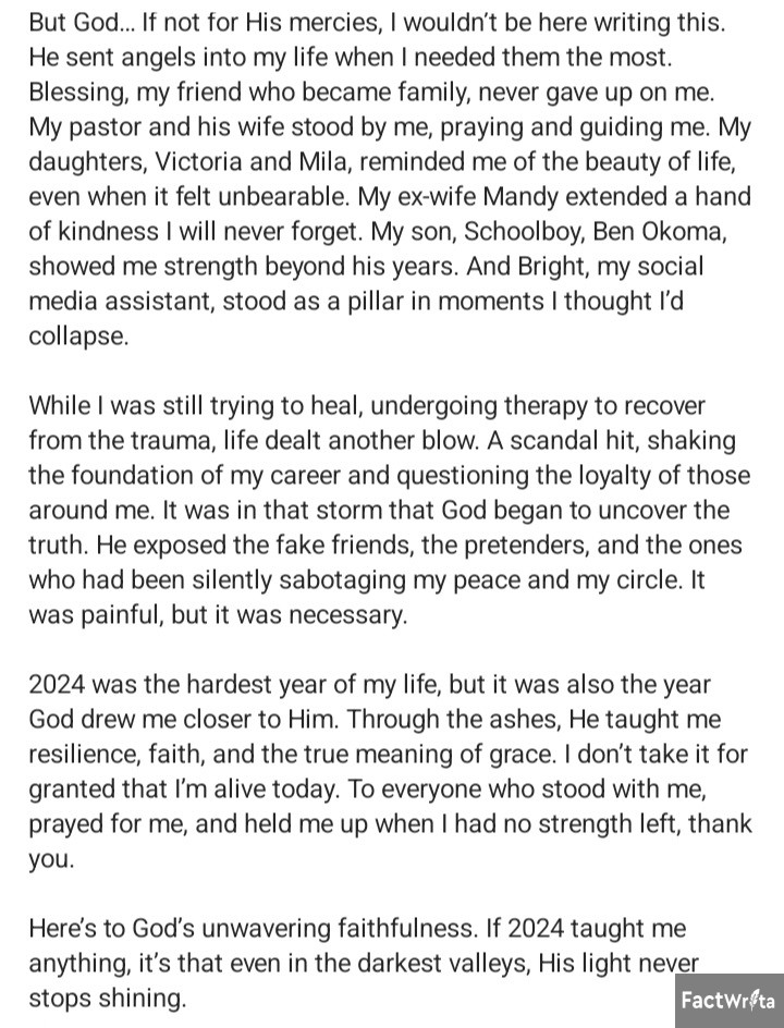 Despite the turmoil, Angel expressed gratitude to his family, pastor, and close friends for their support. Notably, he thanked his wife, ex-wife, and son, emphasizing their role in his emotional recovery. He also reflected on lessons learned, including “fake friends being exposed” and strengthening his faith. “Even in the darkest valleys, God’s light never stops shining,” he concluded, offering hope to followers.