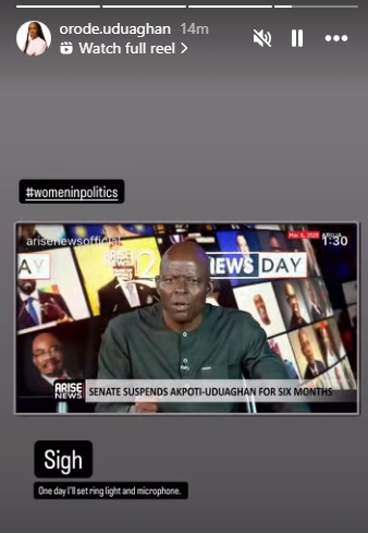 Captioning the clip “#WomenInPolitics. One day I will set a ring light and microphone,” Uduaghan’s cryptic message coincided with the Senate suspension of Natasha Akpoti-Uduaghan, a PDP senator accused of breaching parliamentary rules after alleging s3xual harassment against Senate President Godswill Akpabio.