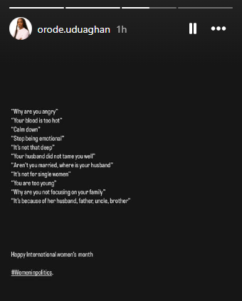 On Thursday, March 5, 2025, Uduaghan—daughter of former Delta Governor Emmanuel Uduaghan—hinted at future revelations about her journey as a woman in politics. In an Instagram post, she shared a clip of Cross River lawmaker Cletus Obun controversially suggesting “mental stability tests” for women aspiring to governorship or senate roles.
