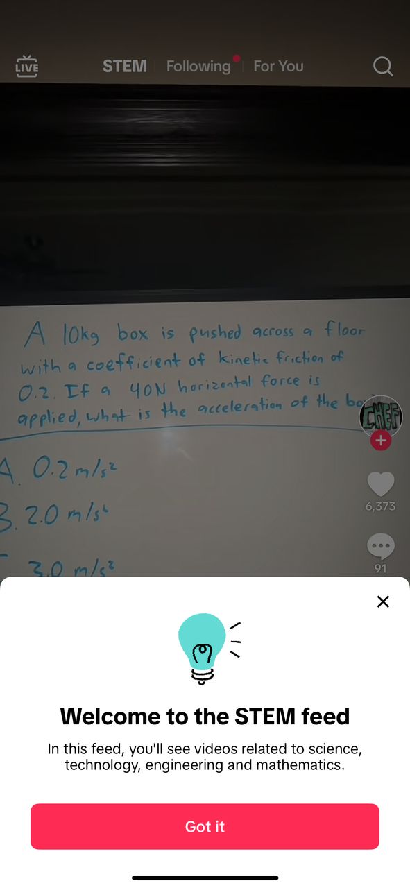 TikTok reports that 25% of teens in the UK, US, Canada, and Ireland engage with the STEM feed weekly. Building on this success, the platform has expanded it globally and added multilingual support (French, German, Spanish, Italian, Arabic).